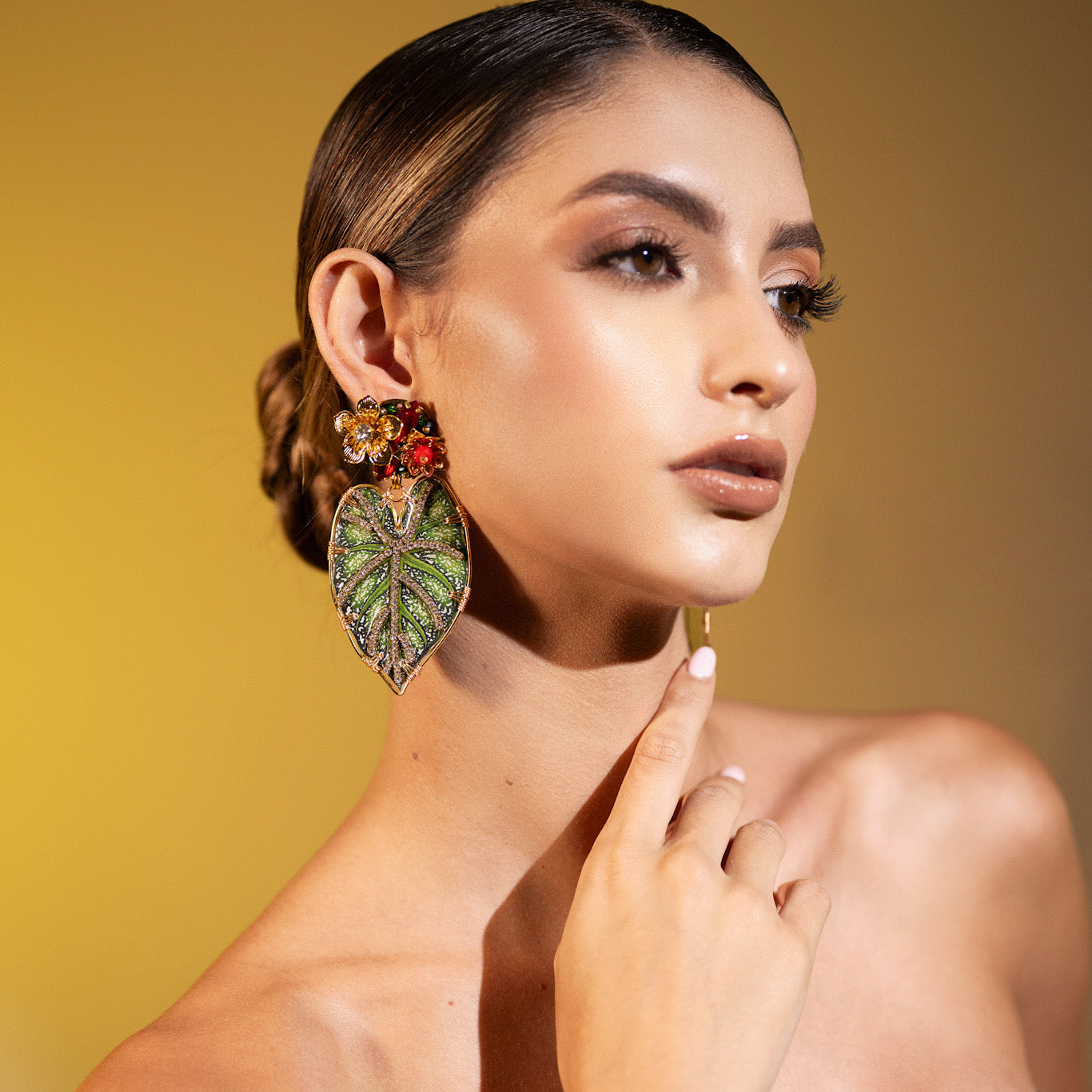 Inglés: This time we enter the Caribbean jungle, far from the sea, to discover the beauty of caladios, alocasias and anthuriums. These pieces are made of compressed and encapsulated recycled paper, with jewelry details plated in 18K gold.