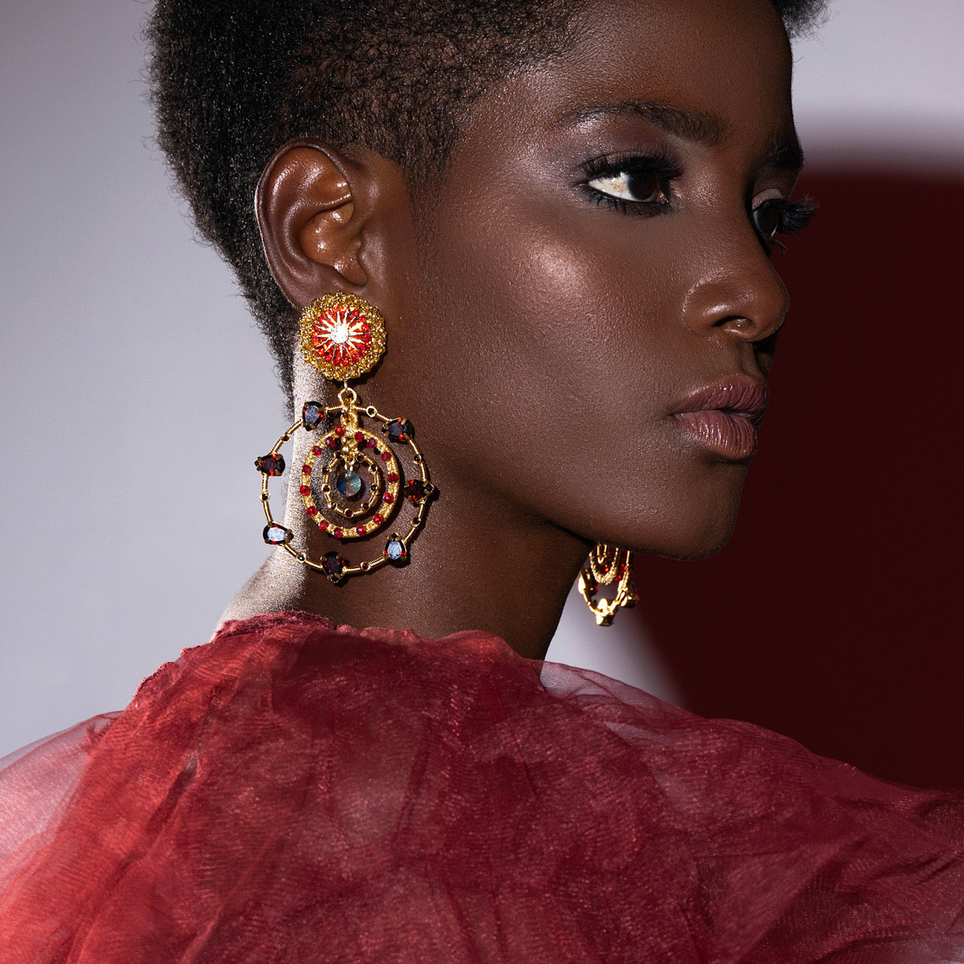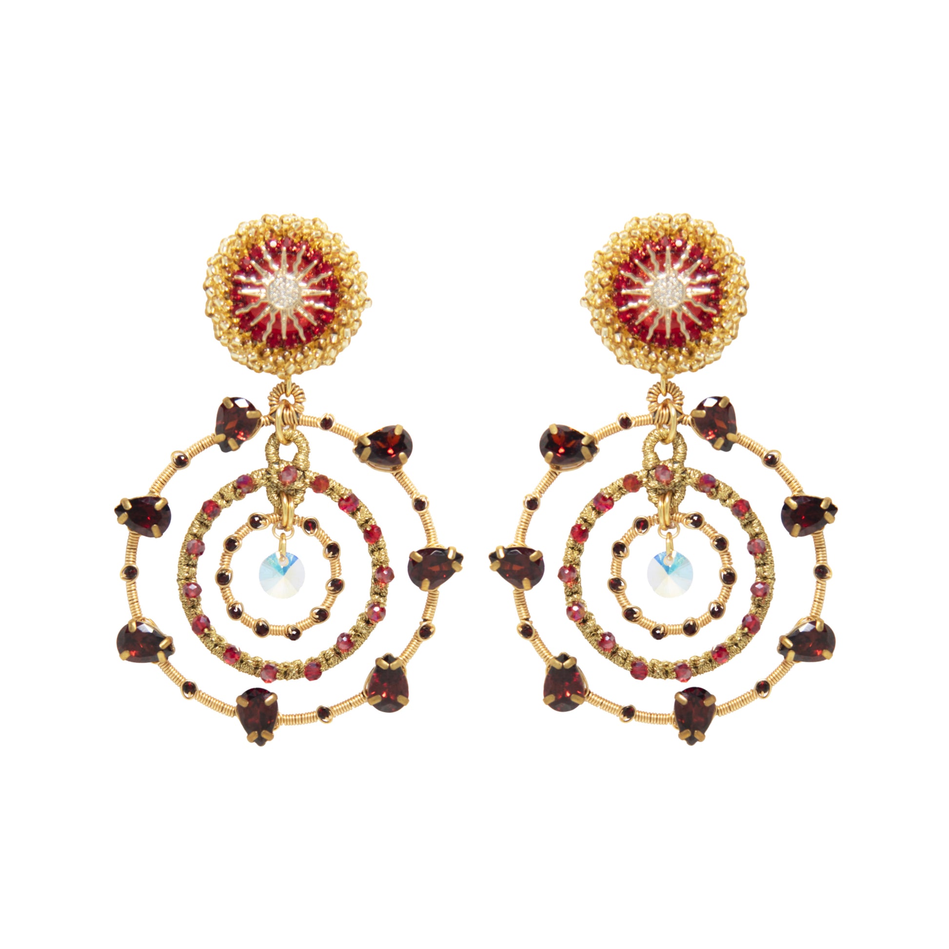 The earring is held with a pole in the shape of a radiant sun or star, made with golden rhinestones and an intense red center, which unifies this jewel of heavenly inspiration. The result is a handmade piece that combines movement, color and a cosmic symbolism.